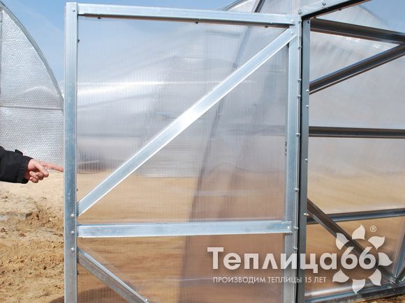 В базовый комплект теплицы Фермер-5,0 входит оцинкованный каркас шириной 5,0м, длиной 4,2м, в комплекте распашная, двухстворчатая дверь. Без поликарбоната.