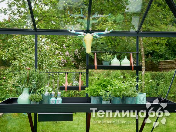 В комплект входит каркас теплицы Juliana Oasis Aluminium площадью 8,8 м² из окрашенного алюминия, закаленное стекло толщиной 4 мм., 2 форточки в торцах, двойная распашная дверь в торце.