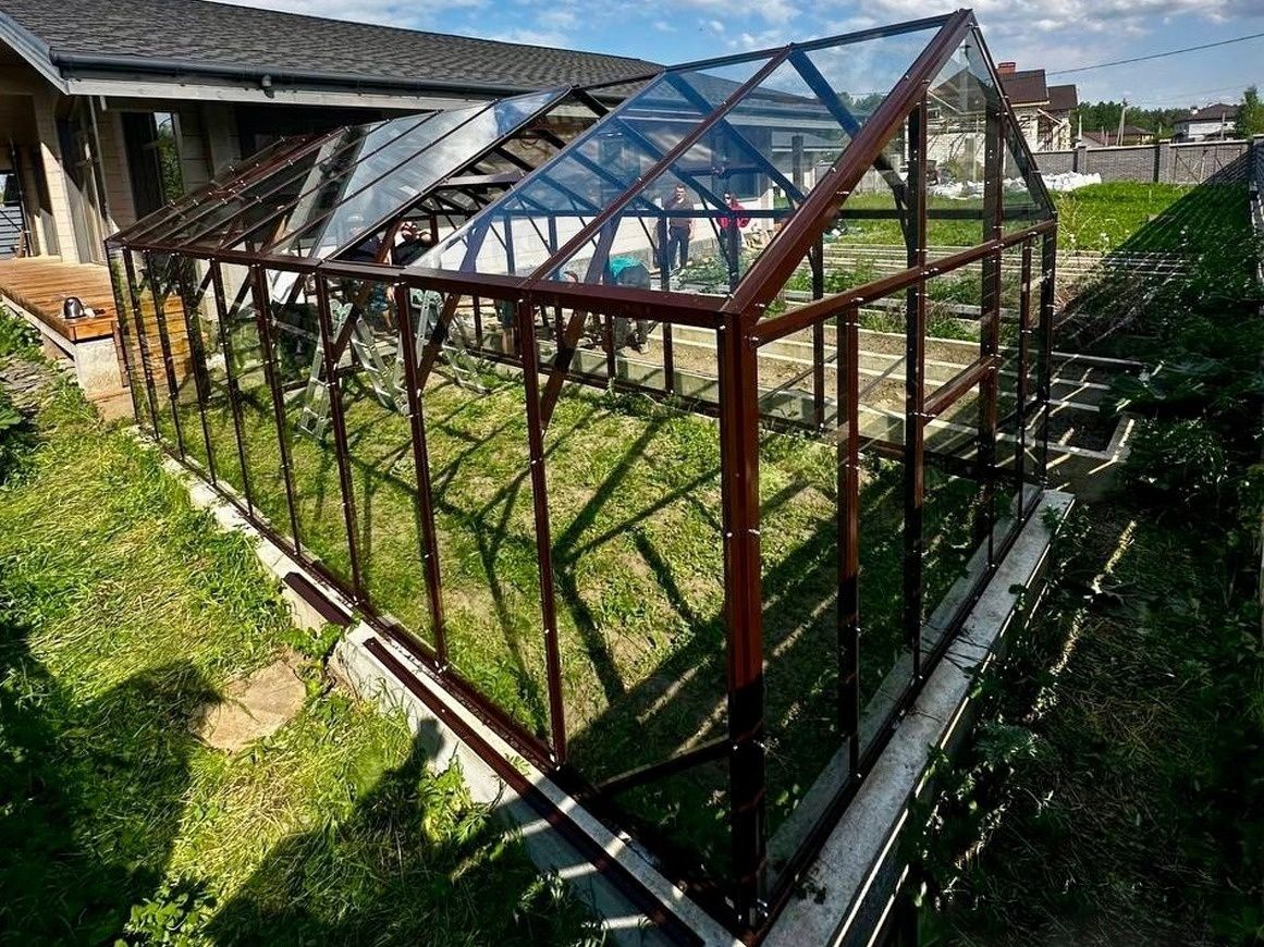 Длина: от 4 м и более — благодаря секциям 0,65м и 0,35м, теплица почти гарантированно встанет на любой размер фундамента.